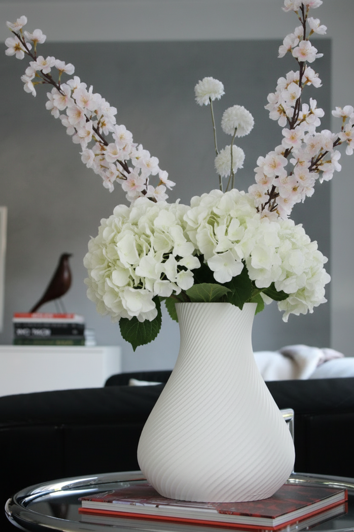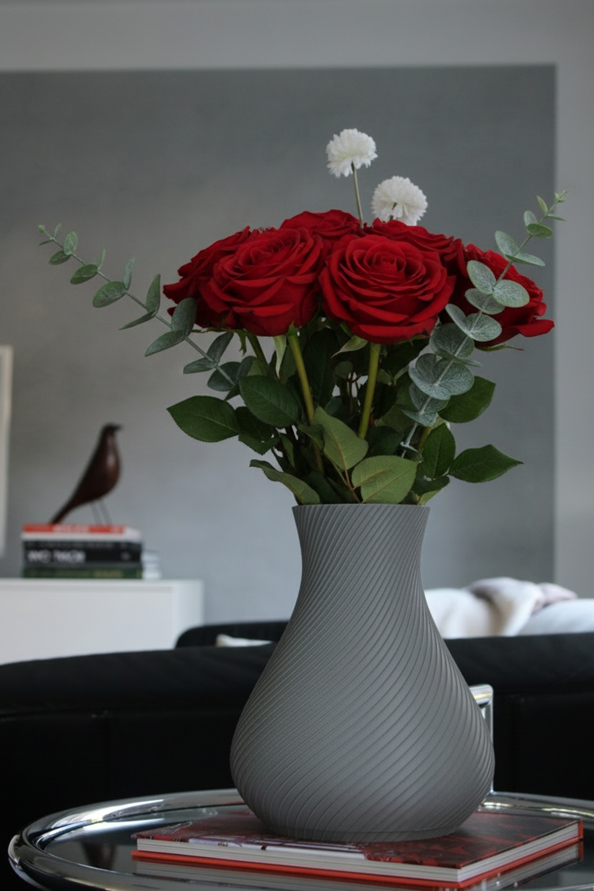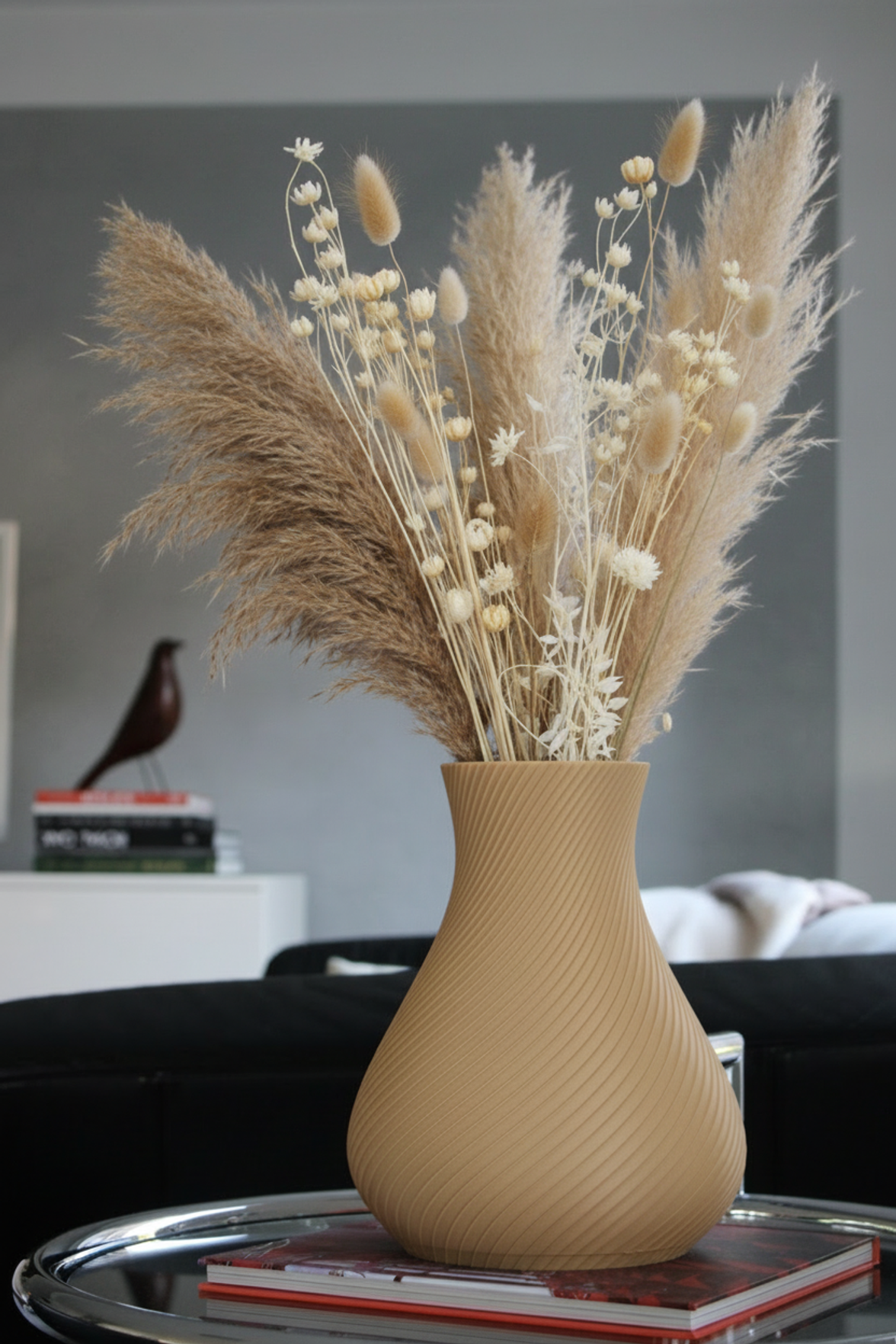 Die sanft geschwungene Silhouette dieser Vase wird durch die feine Spiralstruktur elegant betont. Sie eignet sich ideal für Blumenarrangements oder als dezenter Blickfang und bringt eine ruhige, stilvolle Note in jeden Raum.