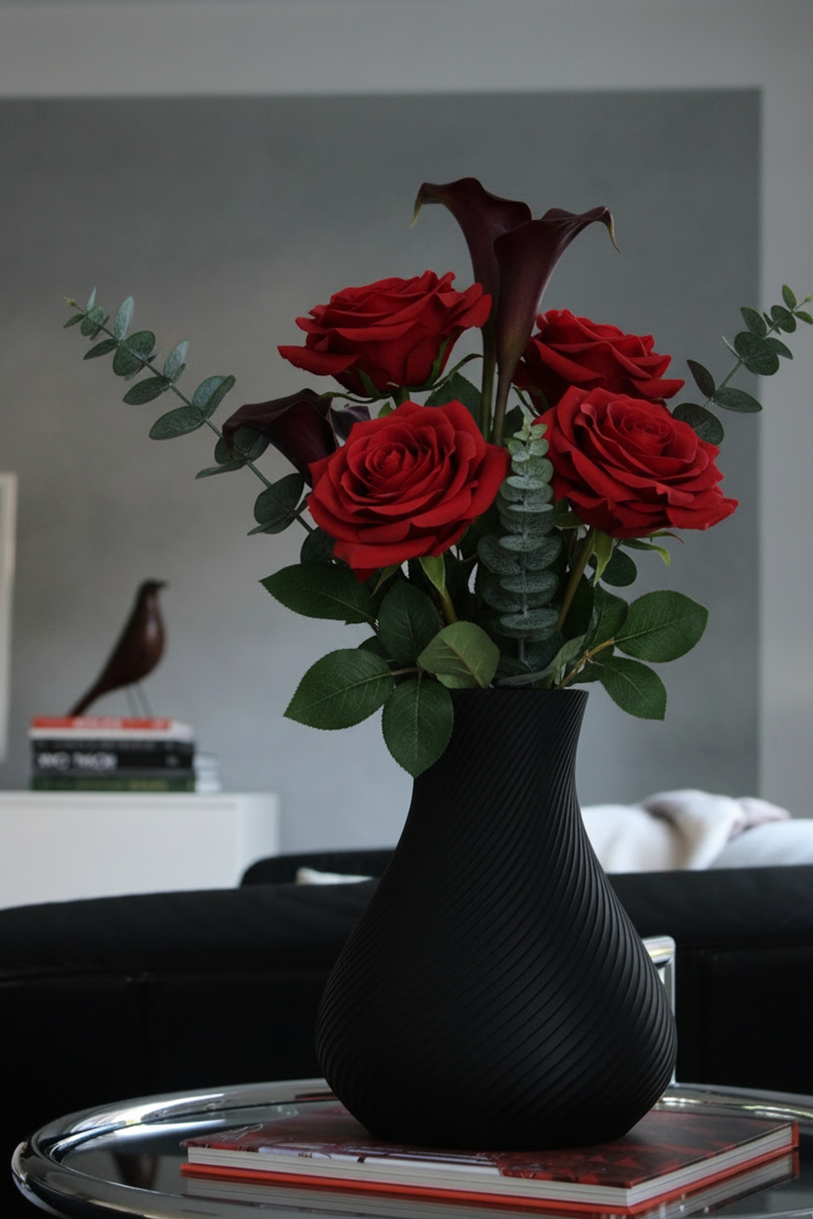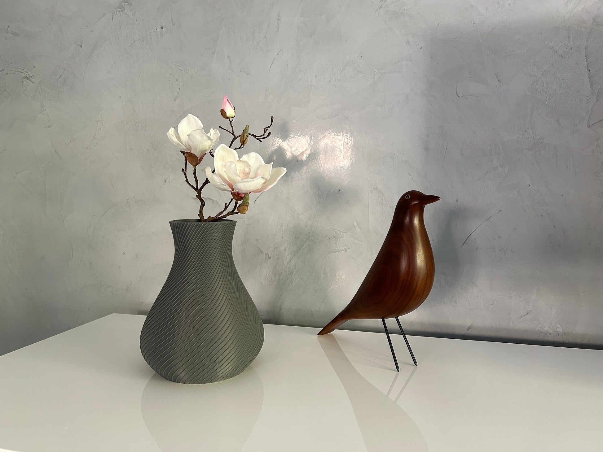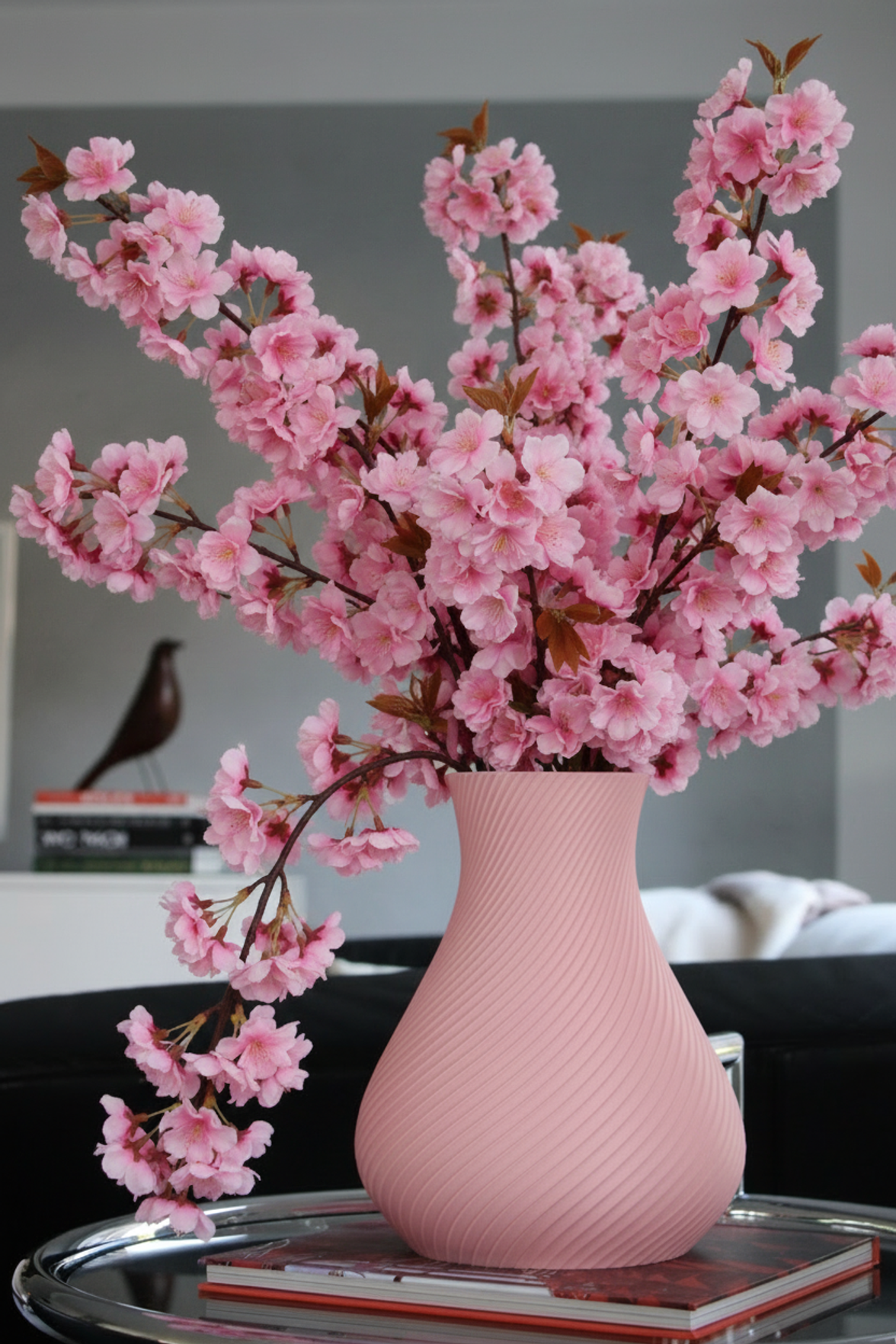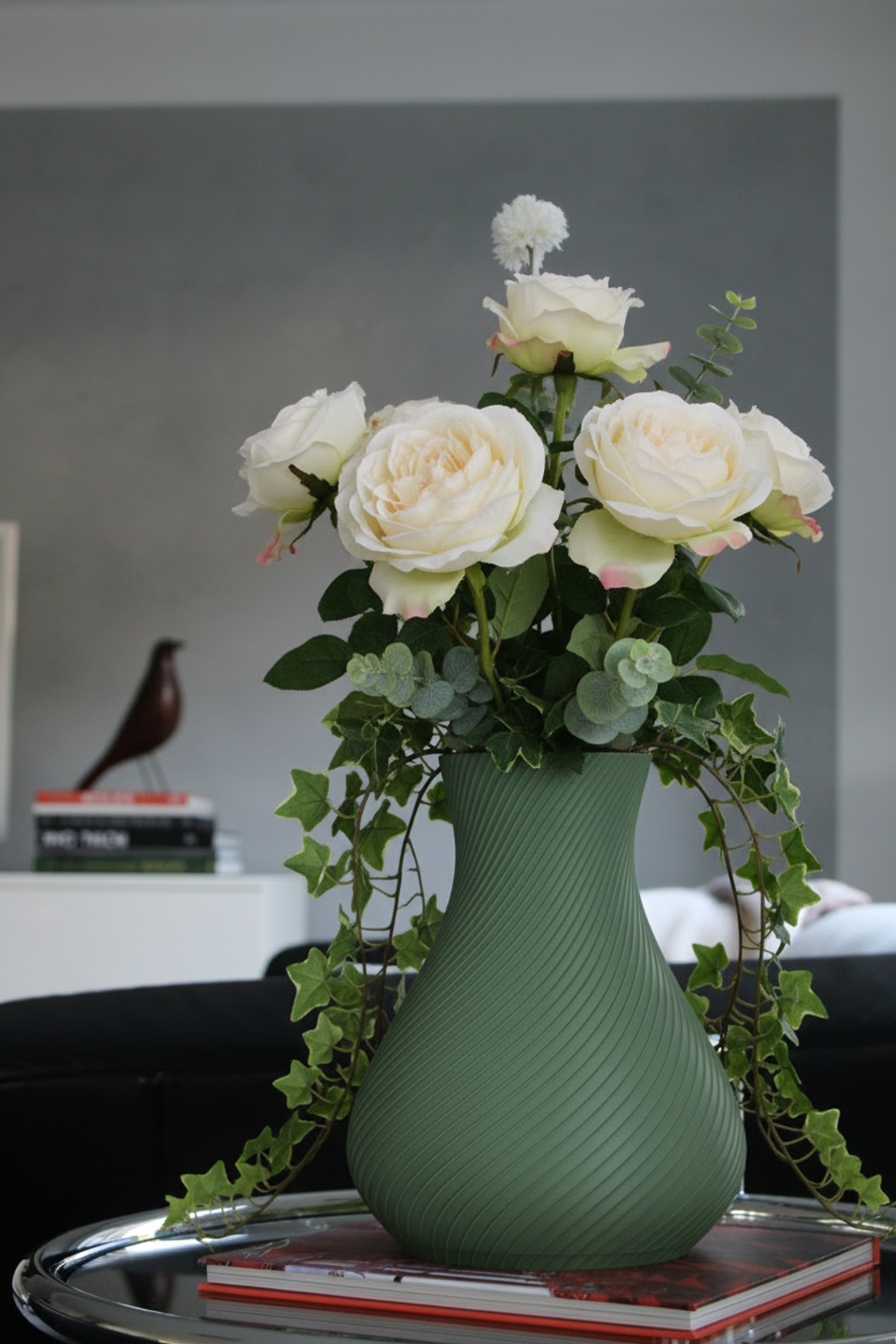 Die sanft geschwungene Silhouette dieser Vase wird durch die feine Spiralstruktur elegant betont. Sie eignet sich ideal für Blumenarrangements oder als dezenter Blickfang und bringt eine ruhige, stilvolle Note in jeden Raum.