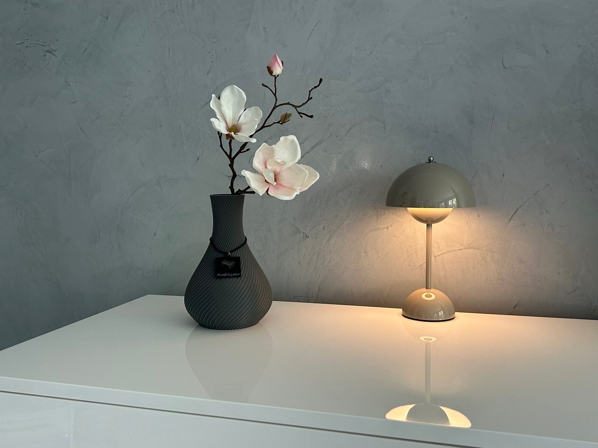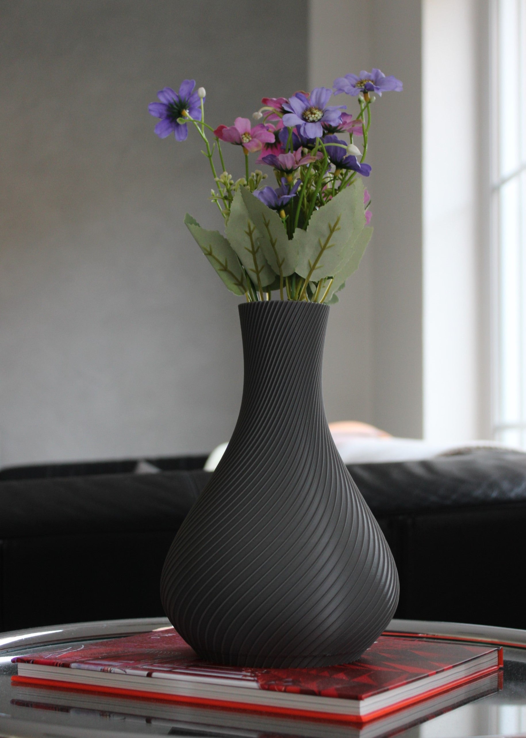Diese Vase besticht durch ihre elegante Silhouette mit schmalem Hals und harmonisch gerundeter Basis. Die dezente Spiralstruktur verleiht ihr Tiefe und macht sie zu einem zeitlosen Designobjekt. Ob als einzelner Blickfang oder kombiniert mit weiteren Stücken – sie setzt Blumen und Zweige stilvoll in Szene und fügt sich in jede Umgebung ein.