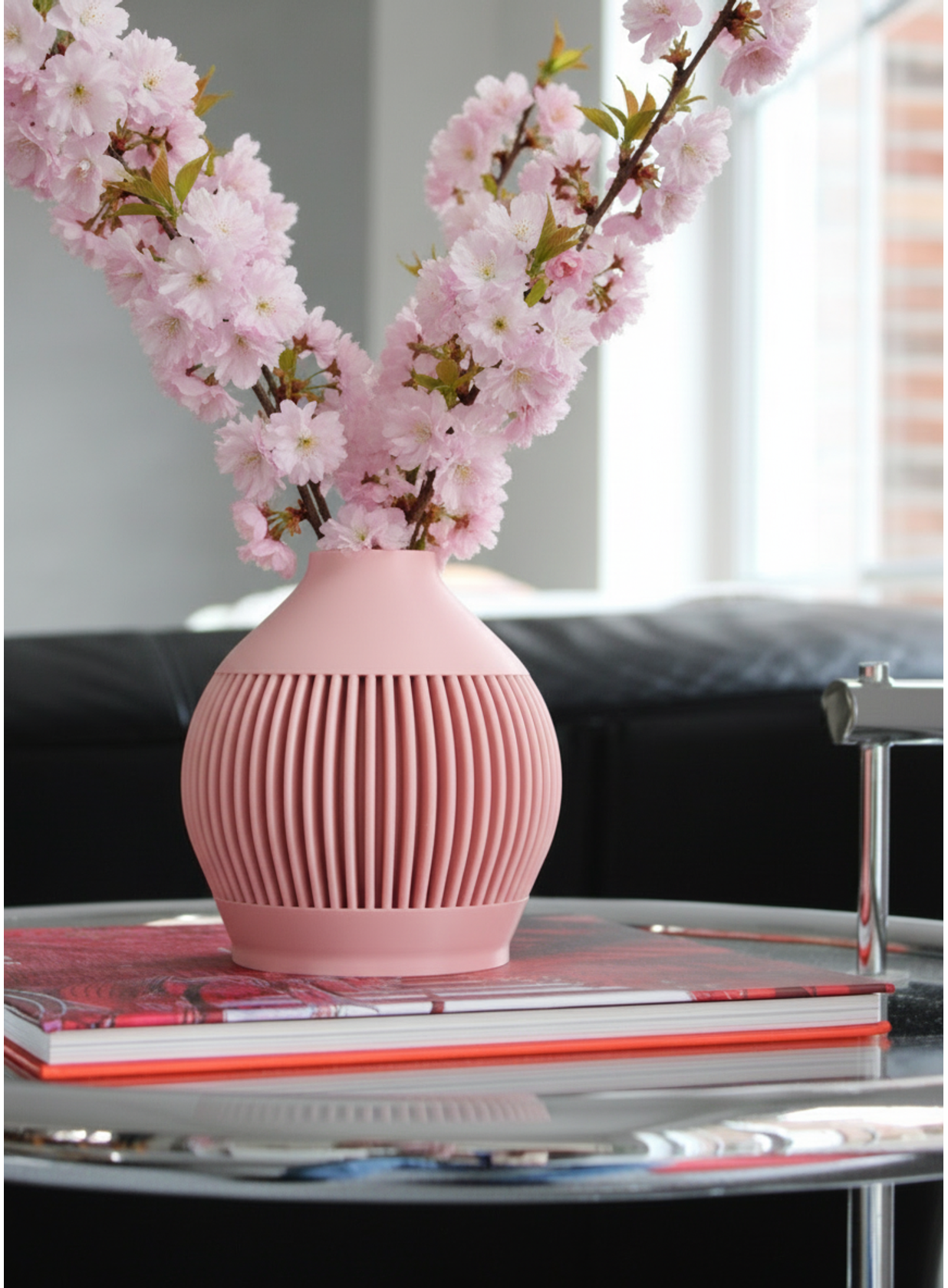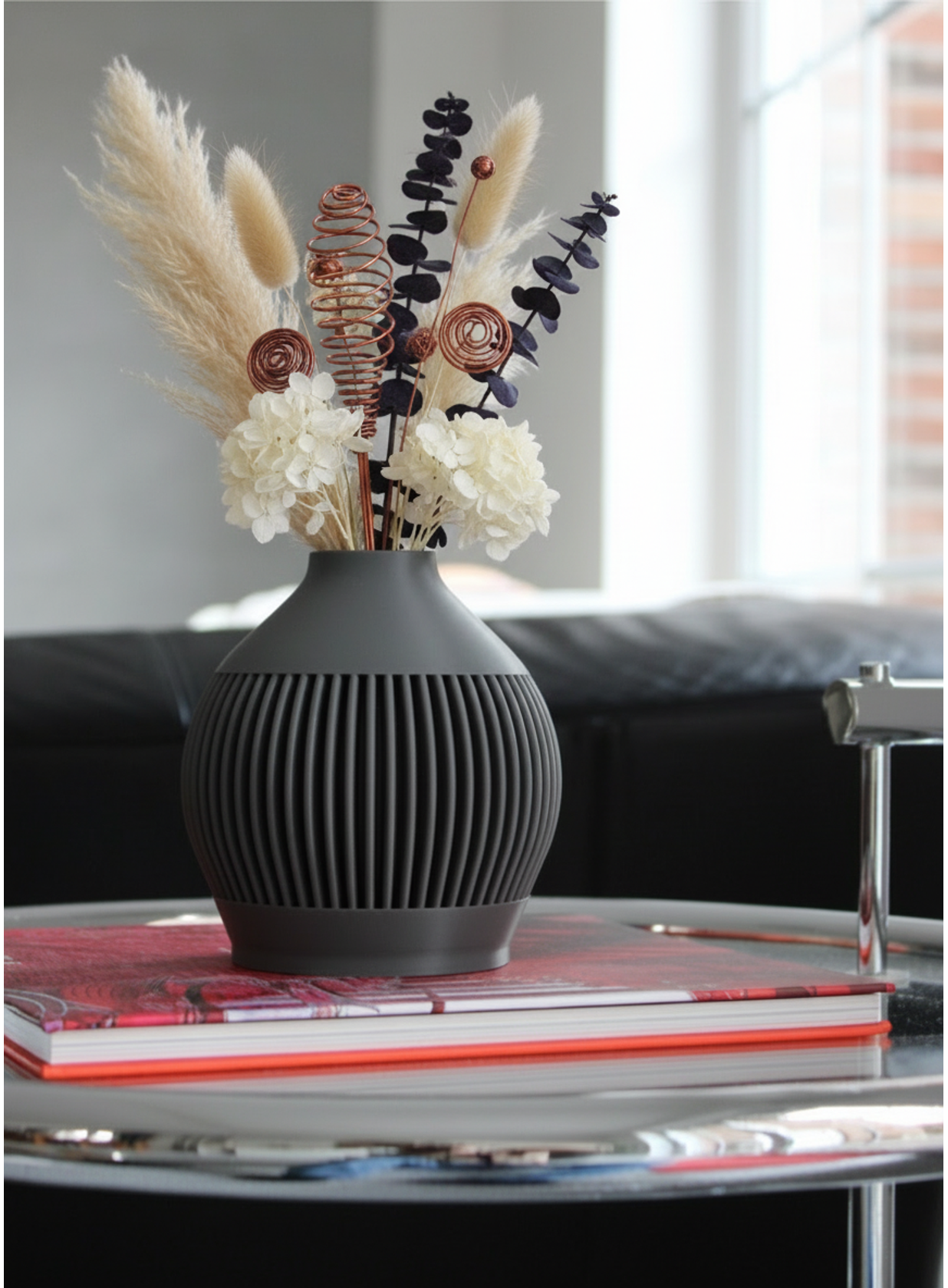 Die klare Silhouette dieser Vase wird durch die vertikale Struktur elegant betont. Sie eignet sich perfekt für einzelne Blumen oder kleine Arrangements und bringt eine moderne, zugleich zeitlose Note in jedes Zuhause.