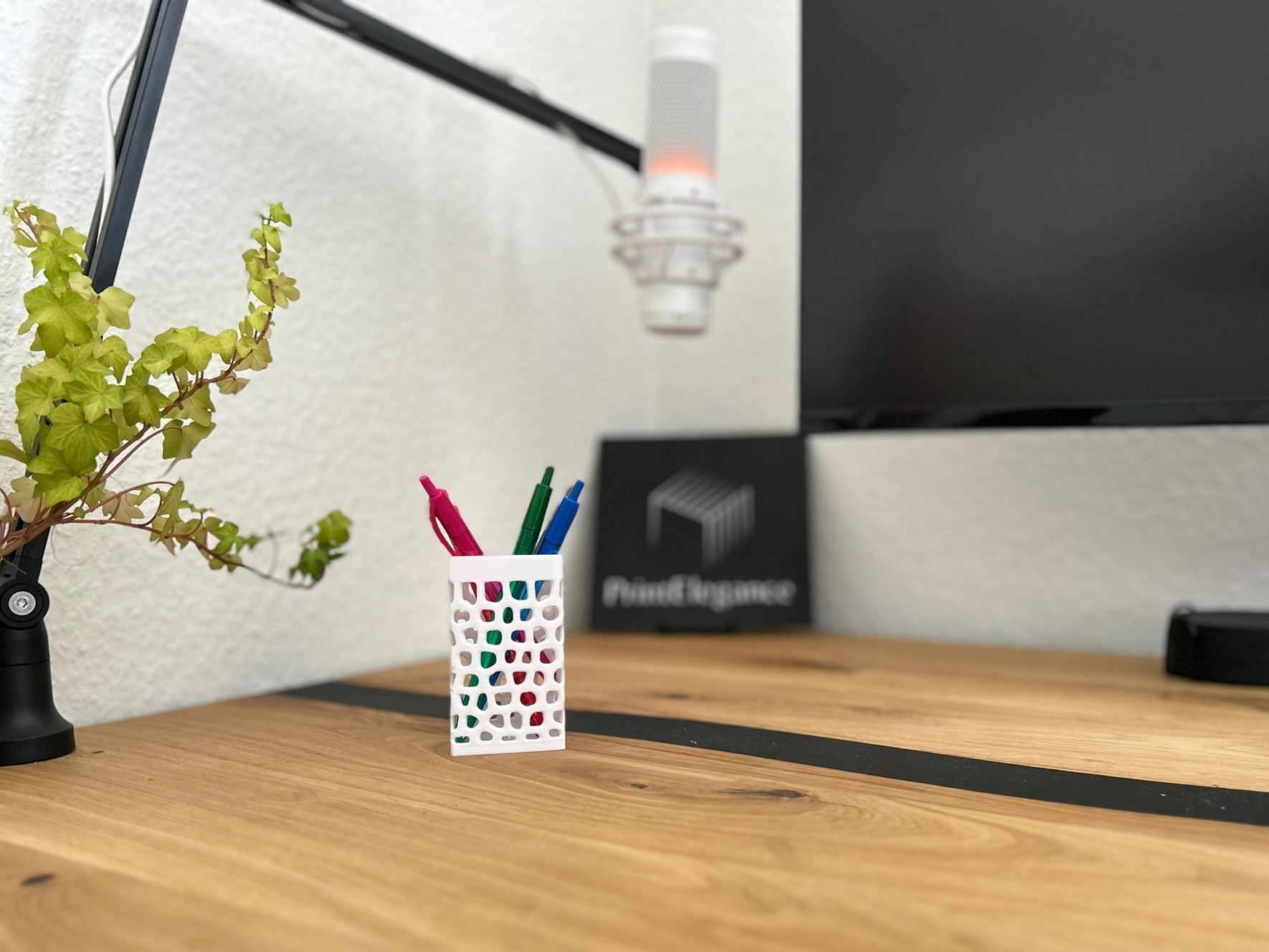 Formvollendete Ordnung für stilvolle Arbeitswelten: Die Stifthalter-Kollektion vereint zeitgemäßes Design mit technischer Raffinesse. Jeder Halter entsteht im präzisen 3D-Druckverfahren und überzeugt durch seine charakteristische, organisch strukturierte Oberfläche – ein haptisches und visuelles Erlebnis.